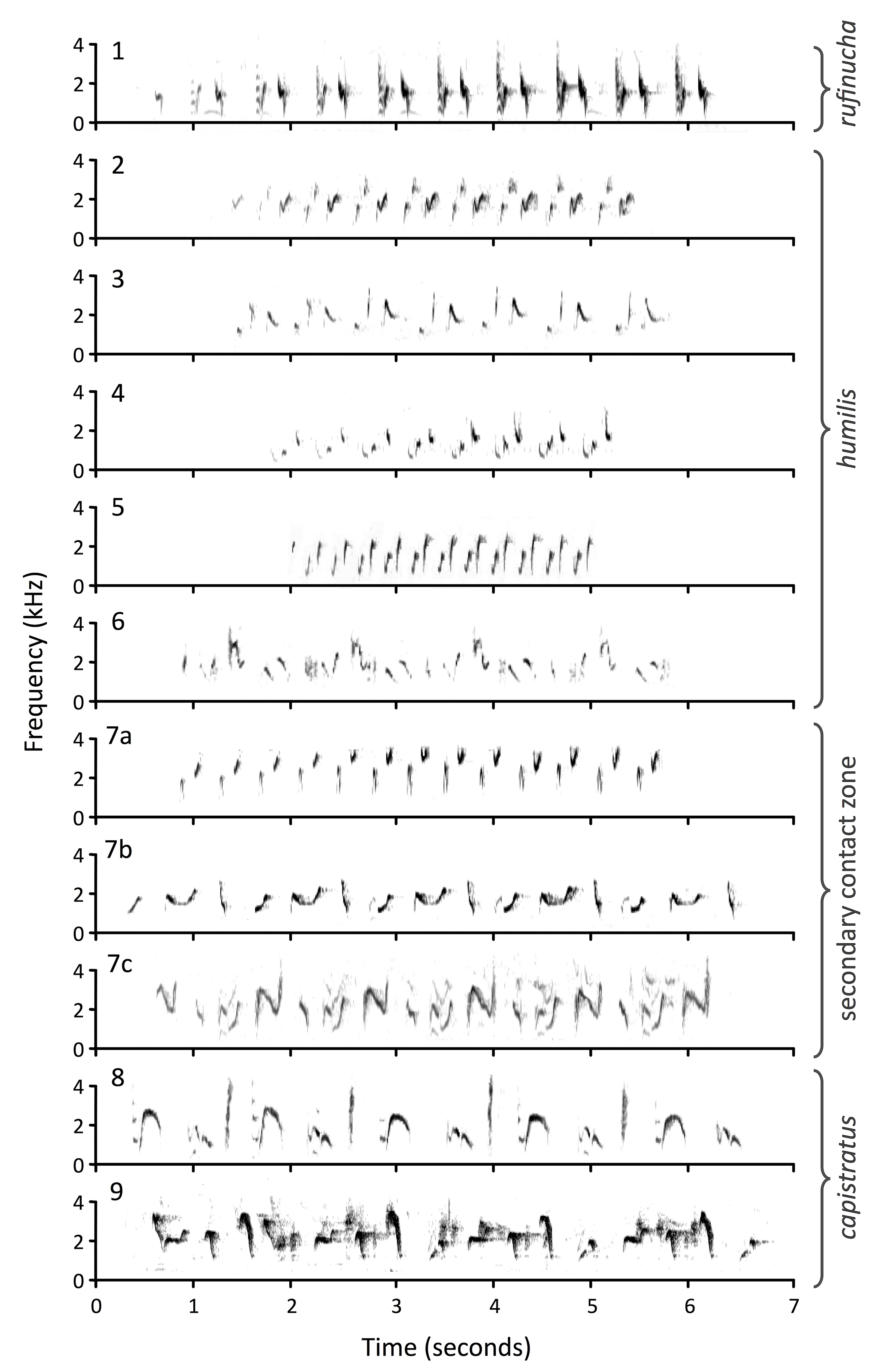 Junto con mis colaboradores demostramos que los cantos de las subespecies de C. rufinucha varían marcadamente, y que esta variación también sigue los patrones geográficos mostrados en caracteres genéticos y morfológicos. También encontramos individuos que vocalizan cantos intermedios entre ambas subespecies, dando soporte a la idea de individuos híbridos. Nuestra investigación demuestra que la divergencia en cantos es proporcional a la divergencia genética entre poblaciones, mientras que la divergencia entre hábitats donde habitan las diferentes poblaciones no se relaciona a la variación vocal, sugiriendo que procesos estocásticos son los mediadores de la variación vocal presente en C. rufinucha. Este artículo fue uno de los 10 más consultados del Journal of Avian biology en el 2013. Más información aquí.